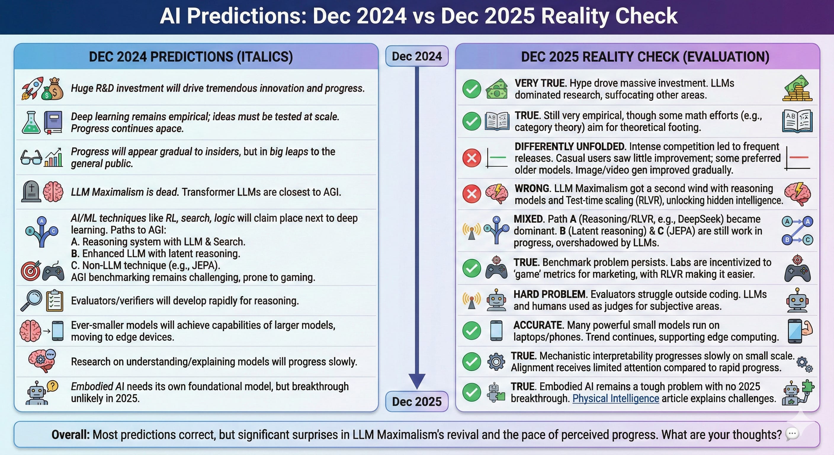 Here’s my evaluation of the predictions I made back in December 2024 with the current state of affairs vis a vis AI. Hope you find this interesting. What were your predictions, and how did they pan out in 2025? Don’t forget to share your thoughts in the comments section!